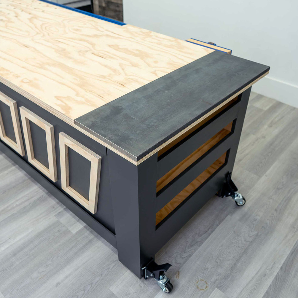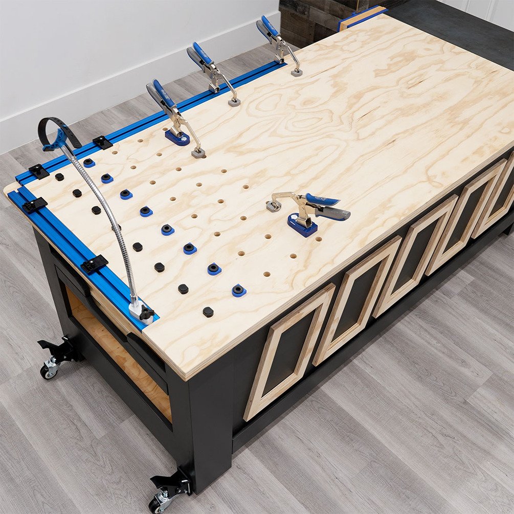 This modern woodworking workbench is designed to optimize your productivity and adapt to any project. It features a versatile top with integrated bench dogs, clamp tracks, and a durable metal work surface, offering the perfect setup for a wide range of woodworking tasks.