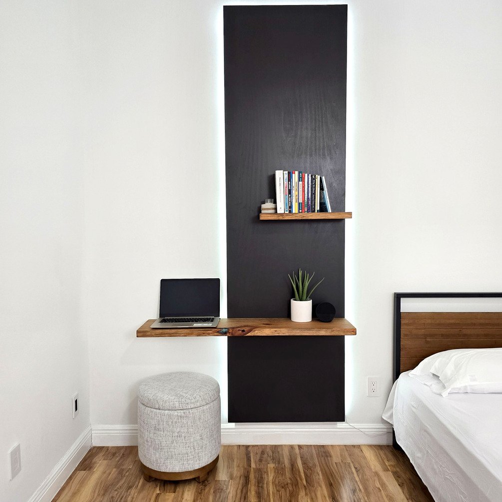 This smart wall station combines a desk, a wall lamp, and a bookshelf into one compact unit. Easy to assemble yourself, it saves wall space while adding a sleek, modern touch to any room. Perfect for small spaces or minimalist setups.